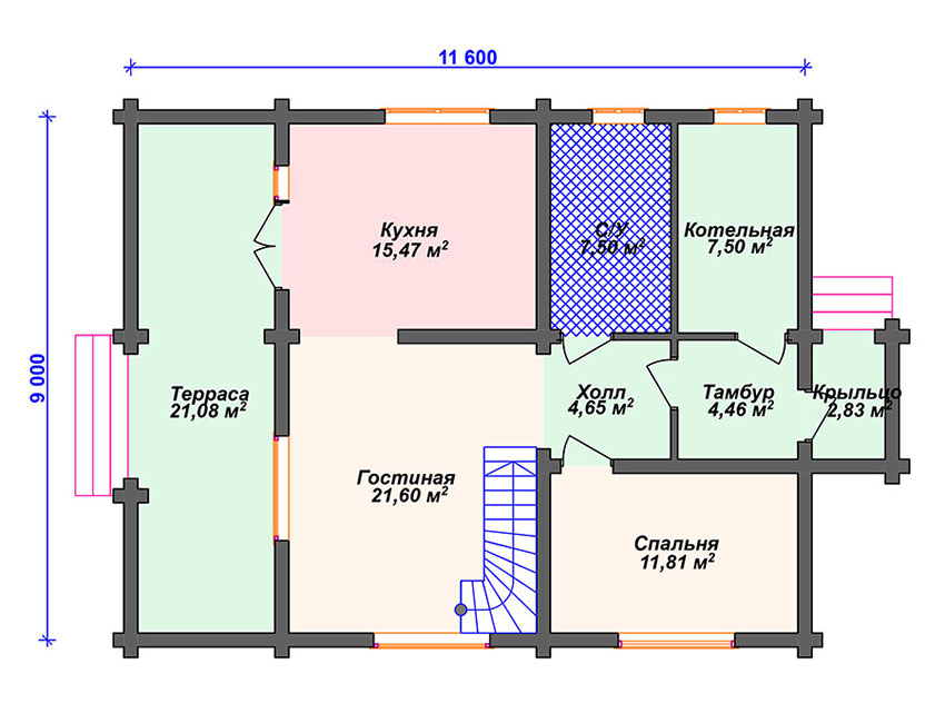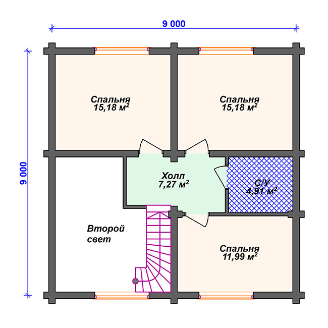 Проект деревянного дома из оцилиндрованного бревна «Загорье» - это лаконичный и грамотный подход к строительству удобного, компактного жилья. В доме общей площадью 149.3 м2 расположено все необходимое для комфортного проживания. План строения предполагает двухэтажное здание с 3 спальнями, С/У, холлом и вторым светом на территории мансарды. На первом этаже располагаются большая кухня, гостиная, еще один С/У и спальня, длинная терраса, хозяйственные помещения. Присутствует в проекте и веранда, где вы сможете скоротать теплые летние вечера.